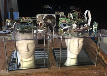 Wood, perspex, stainless steel, tiles, plaster of paris and computer parts for fun